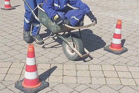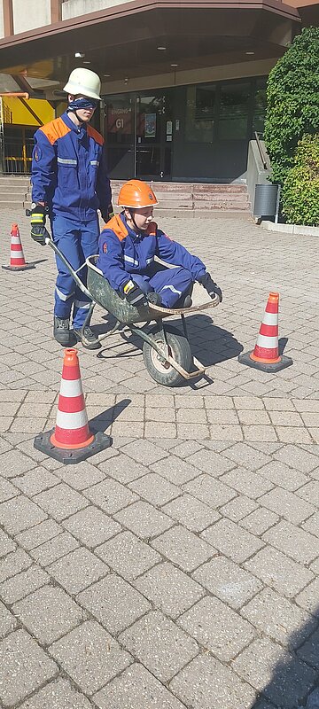 Im Bereich Sport und Spiel musste ein Trupp mit der Schubkarre durch einen Parcour fahren. Der Jugendliche in der Schubkarre gab die Kommandos, während der zweite Jugendliche die Schubkarre mit verbundenen Augen schieben musste.