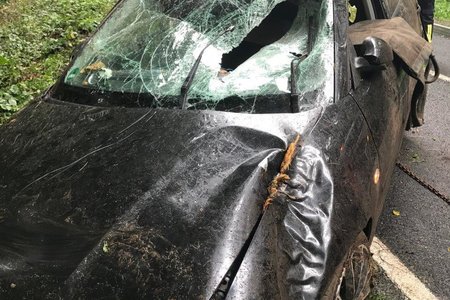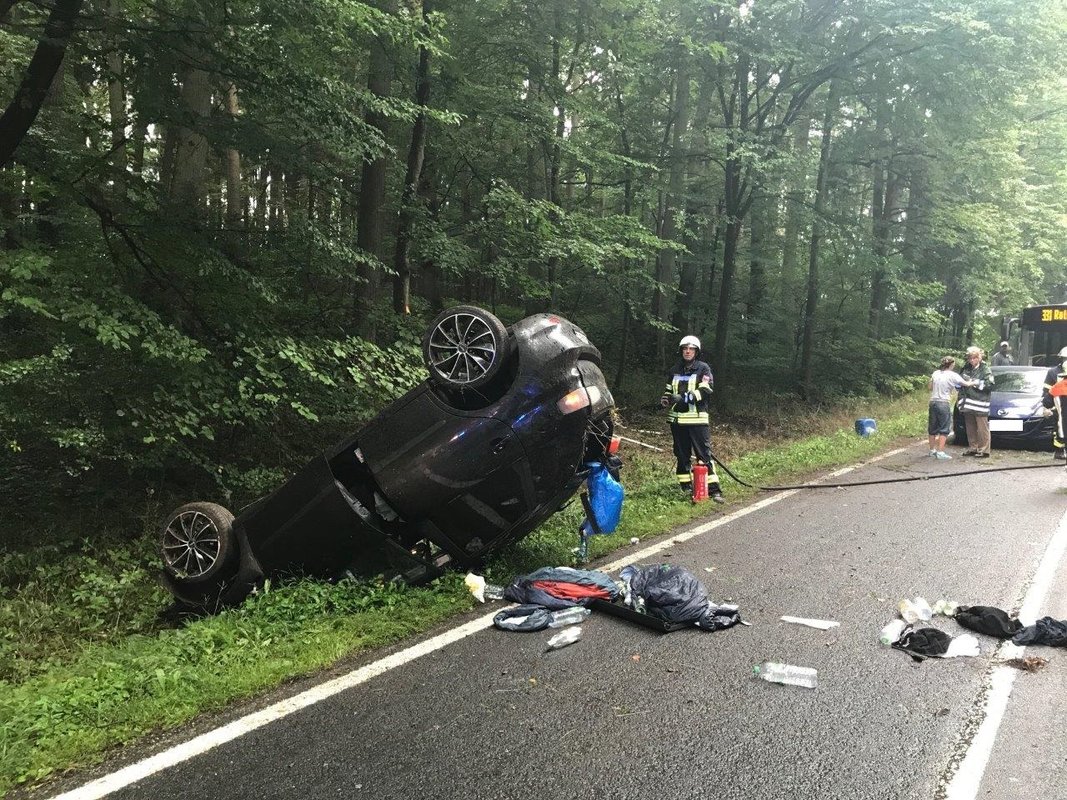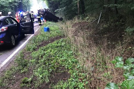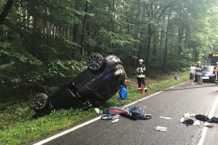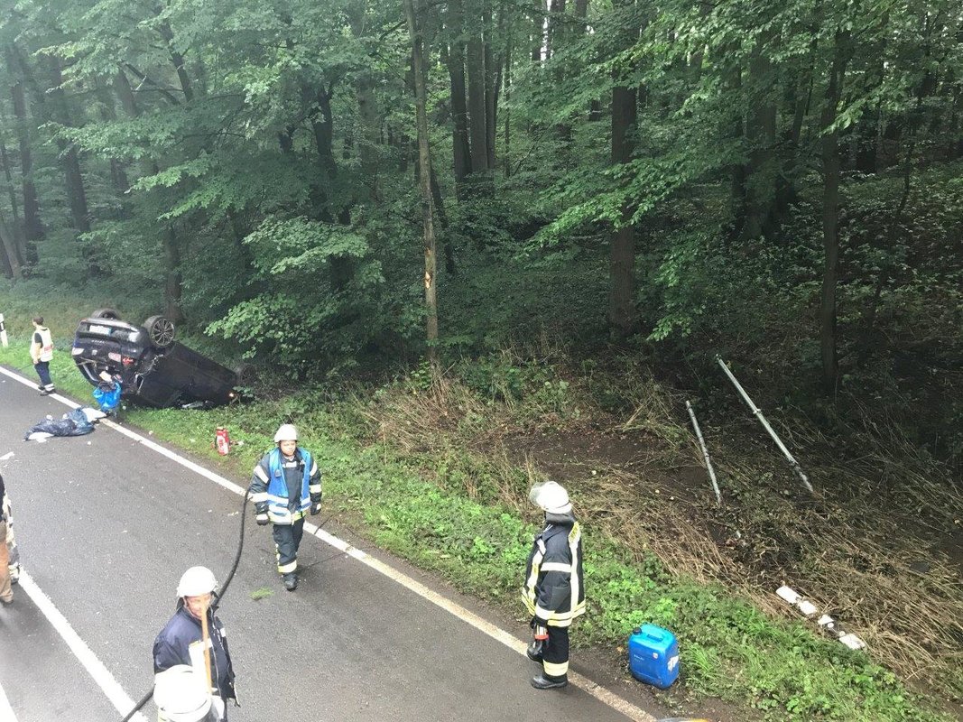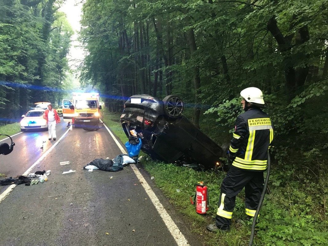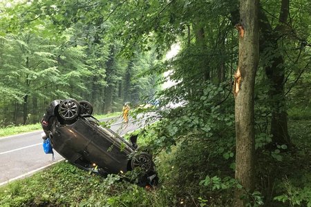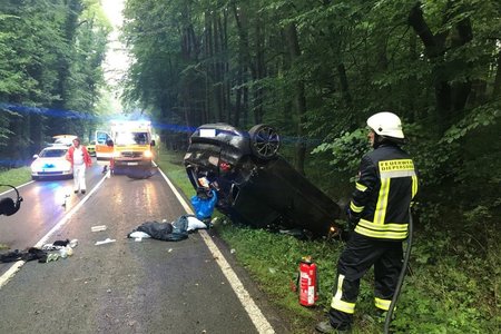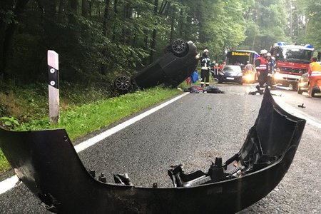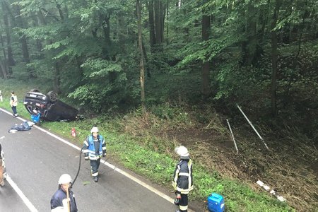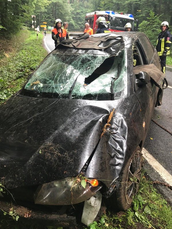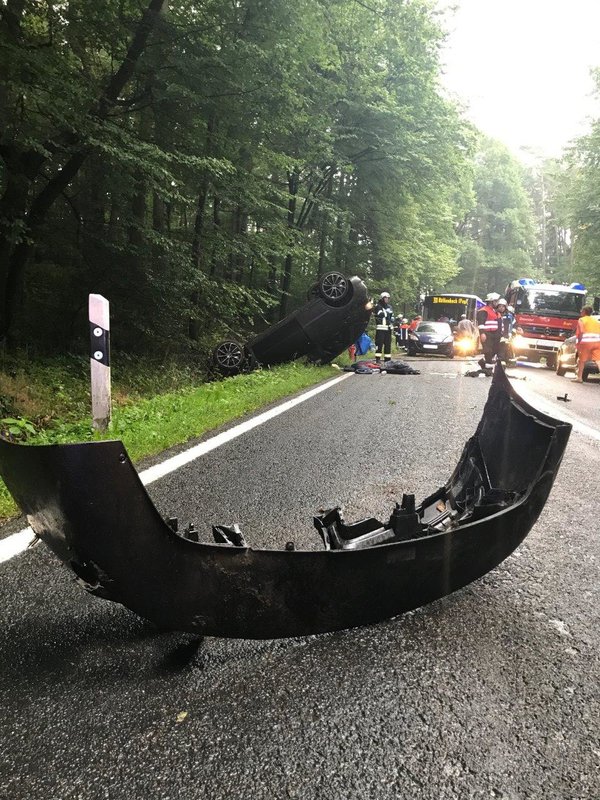 Auf der Staatsstraße 2240 in Fahrtrichtung von Diepersdorf nach Lauf kam es zu einem schweren Unfall: Ein Seat Ibiza, besetzt mit zwei Personen, kam auf regennasser Fahrbahn nach rechts in den Wald ab. Dort fuhr er frontal auf ein Verkehrsschild, welches sich durch die Windschutzscheibe bohrte. Anschließend touchierte der PKW zwei Bäume auf einer Höhe von knapp 2,0 Meter und blieb schließlich auf dem Dach im Graben liegen.