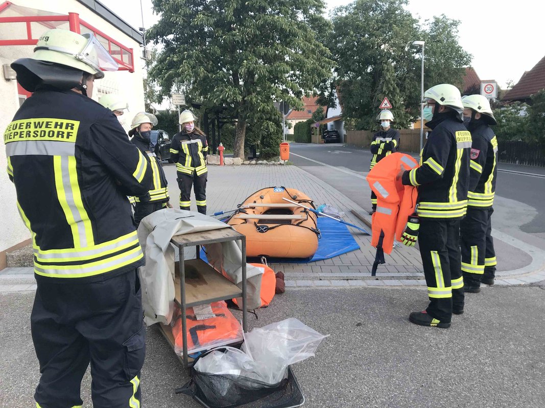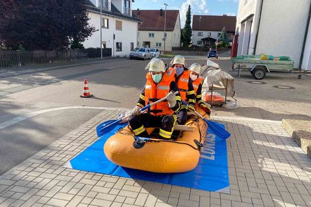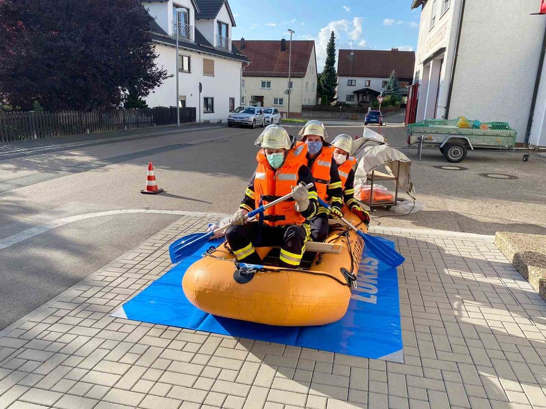 Anschließend wurden die Anwesenden in drei Gruppen eingeteilt: Die Gruppe 1 übte vor der Fahrzeughalle rund um das Thema Boot. So wurde das Schlauchboot gemeinsam in Betrieb genommen, die zusätzliche persönliche Schutzausrüstung probiert und das richtige Verhalten bei der Rettung / Bergung einer Person aus dem Wasser. Auch wurden ein paar Kniffe gezeigt, wie man das Boot leichter wieder ans Ufer zurückholt und die Kameraden dabei entlasten kann.