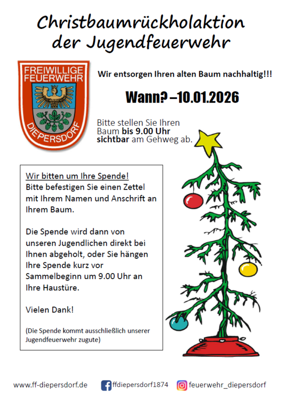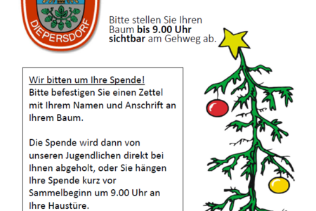Am kommenden Samstag, den 10.01.2026 sammelt die Jugendgruppe der Feuerwehr Diepersdorf wieder die Christbäume in Diepersdorf ein.