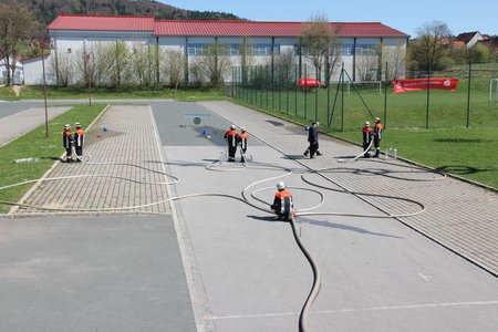 Nach den Einzelaufgaben geht es dann an den gemeinsamen Löschaufbau der Gruppe. Die Positionen des Gruppenführers und des Maschinisten sind innerhalb der neunköpfigen Gruppe festgelegt. Die restlichen Aufgaben bzw. Posten werden im Losverfahren zugeteilt.
