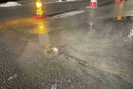 Vor Ort zeigte sich, dass durch einen kleinen Wasserrohrbruch, Wasser auf die Straße austritt.
