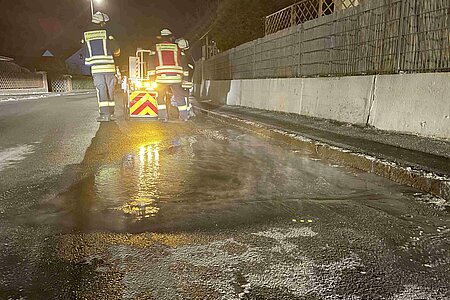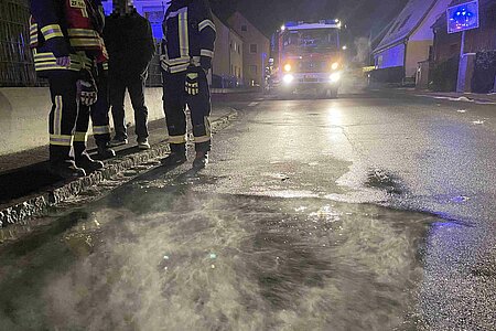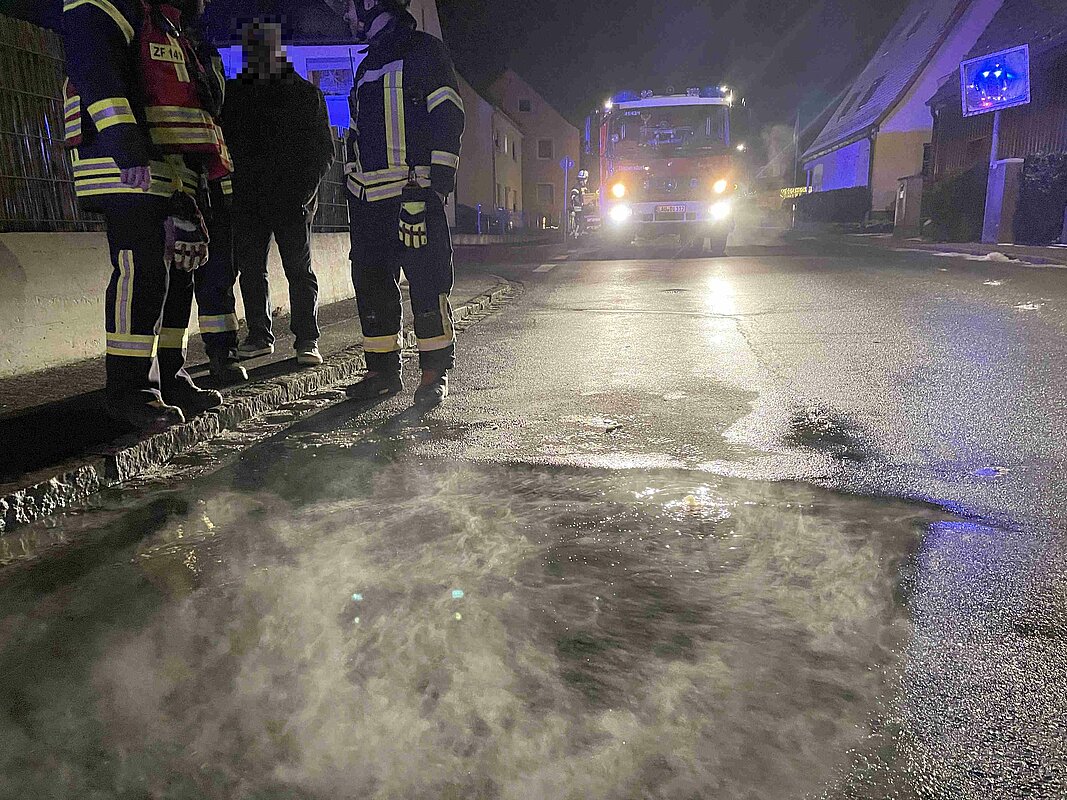 Aufgrund der Minusgrade in dieser Nacht gefror das austretende Wasser auf die Hauptstraße.
