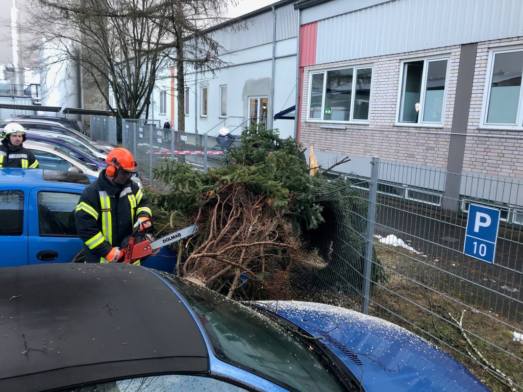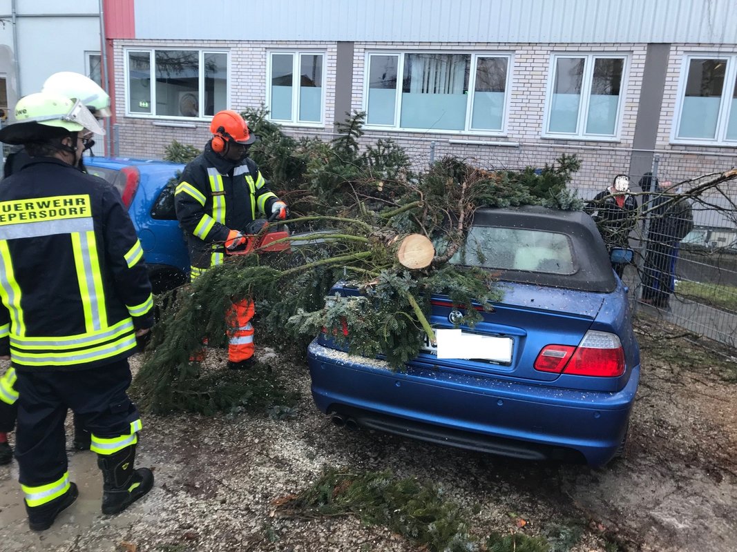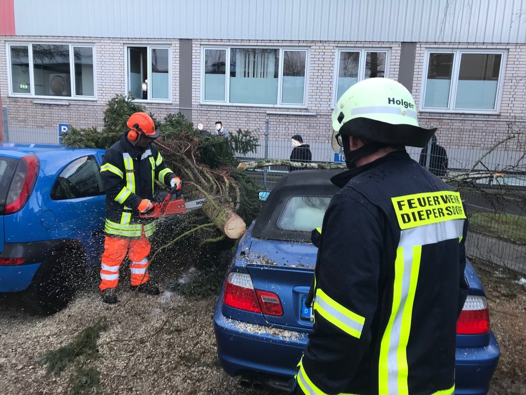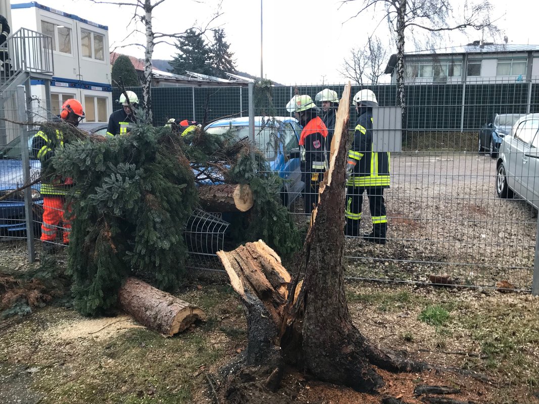 Um 15:13 Uhr löste die Integrierte Leitstelle (ILS) Nürnberg Alarm für die Kameraden der FF Diepersdorf aus. In der Industriestraße war bei einem Unternehmen ein Baum durch den heftigen Sturm umgeknickt und auf zwei parkende Fahrzeuge gefallen. Die Zaunanlage wurde in dem Bereich komplett zerstört, konnte aber den Schaden an den Fahrzeugen etwas abgefangen. Die Feuerwehr sicherte den Bereich ab und befreite die beiden Fahrzeuge von dem quer liegenden Baum.