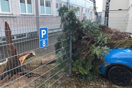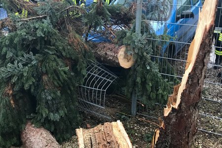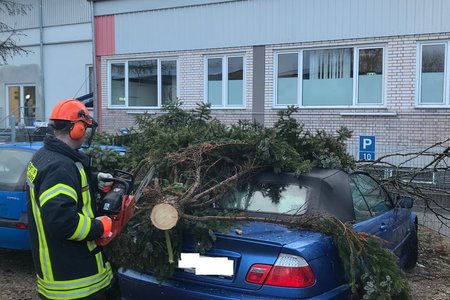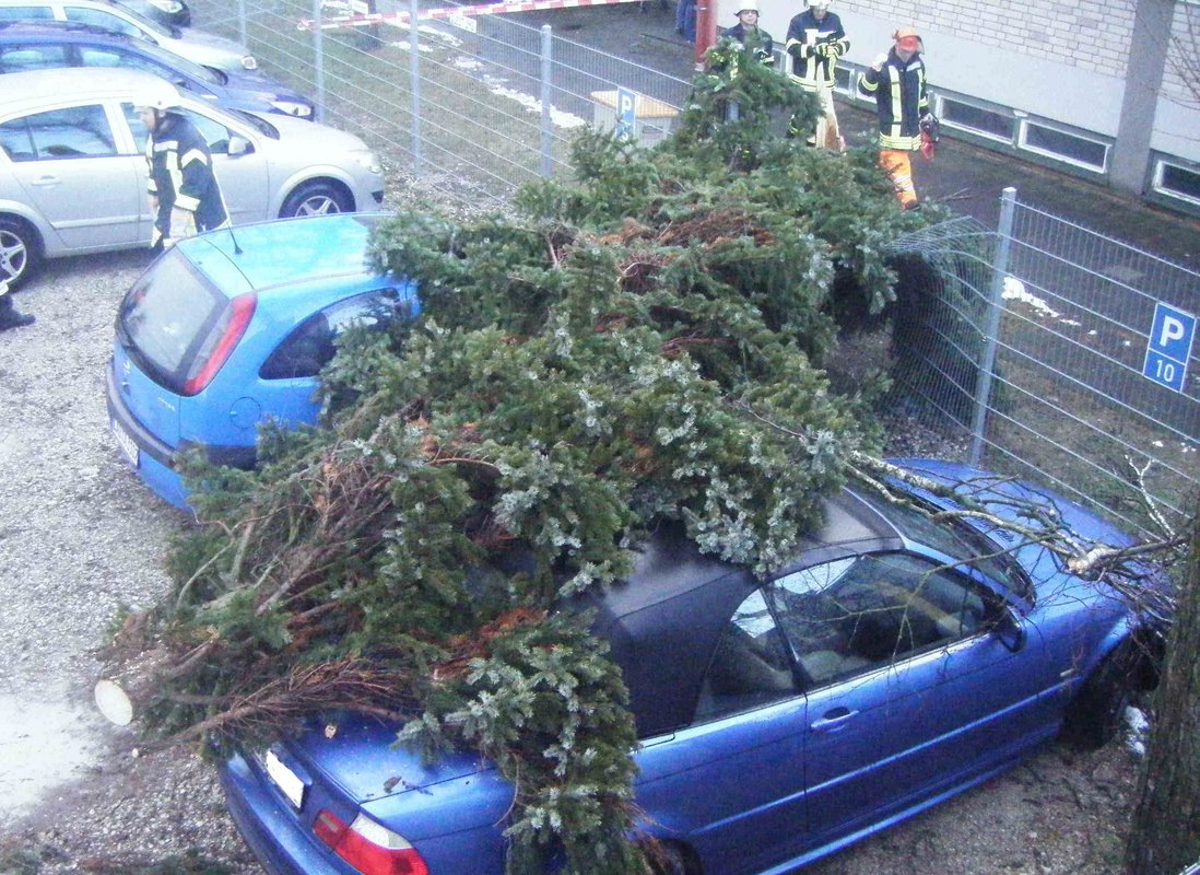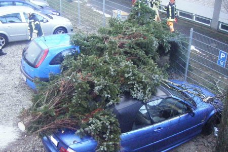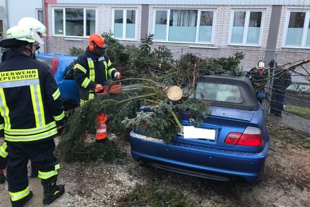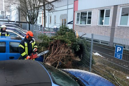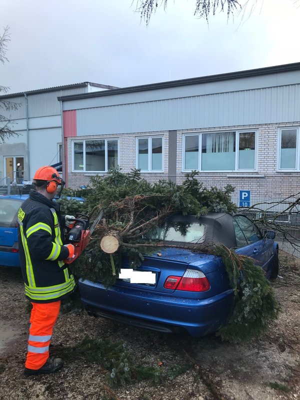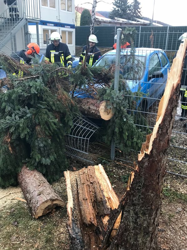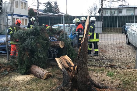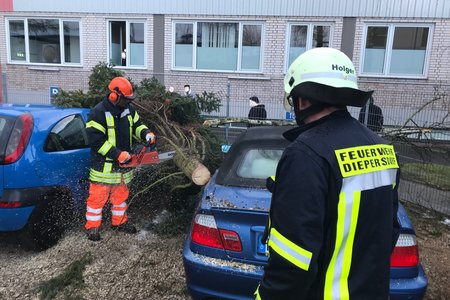 Um 15:13 Uhr löste die Integrierte Leitstelle (ILS) Nürnberg Alarm für die Kameraden der FF Diepersdorf aus. In der Industriestraße war bei einem Unternehmen ein Baum durch den heftigen Sturm umgeknickt und auf zwei parkende Fahrzeuge gefallen. Die Zaunanlage wurde in dem Bereich komplett zerstört, konnte aber den Schaden an den Fahrzeugen etwas abgefangen. Die Feuerwehr sicherte den Bereich ab und befreite die beiden Fahrzeuge von dem quer liegenden Baum.