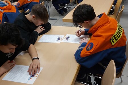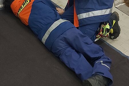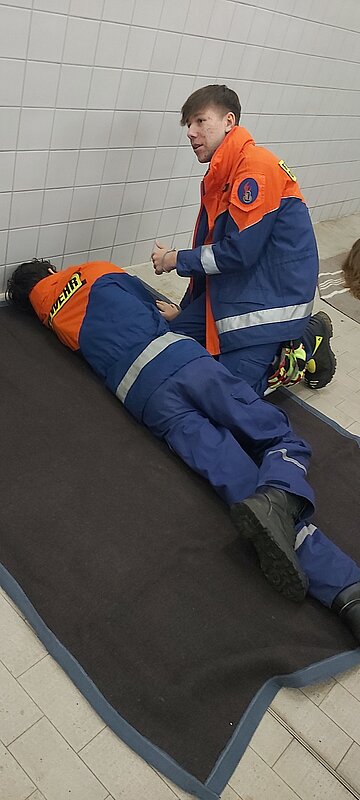 Aufgrund der hohen Teilnehmerzahl, wurden die Jugendlichen nach ihrer jeweiligen Abnahmestufe in zwei Gruppen aufgeteilt. Da die Jugendlichen, welche Stufe 1 und 2 ablegten nur einen Theorieteil hatten, starteten diese im Lehrsaal mit Ihren Fragebögen. Zeitgleich starteten die Jugendlichen, die Stufe 3 und 4 ablegten in der Fahrzeughalle mit dem Praxisteil des Wissenstestes. Im Praxisteil musste das Auffinden einer Bewusstlosen Person und die stabile Seitenlage erklärt und vorgeführt werden. Nachdem alle mit dem Praxisteil fertig waren und die Jugendlichen der Abnahmestufe 1 und 2 ihren Theorieteil fertig hatten, tauschten die Gruppen. Die Jugendlichen der Stufe 3 und 4 legten im Lehrsaal noch ihren Theorieteil ab.