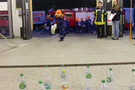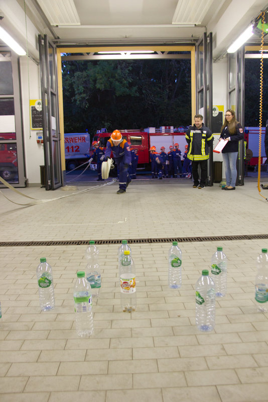 Im praktischen Teil gab es insgesamt 4 Stationen. Bei der Station 1 mussten die Kameraden einen C-Schlauch ausrollen. Von der Startlinie weg war in Abstand von drei Metern eine erste Linie gezogen. Nach weiteren 2 Metern standen dann 10 Kegel, welche als Ziel dienten. So musste der Jugendliche den Schlauch ausrollen und je nach Wurfweite und ob Kegel abgeräumt wurden, gab es eine entsprechende Anzahl an Punkten.