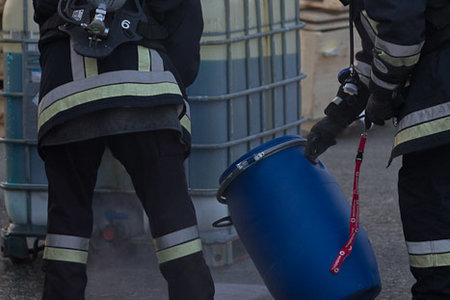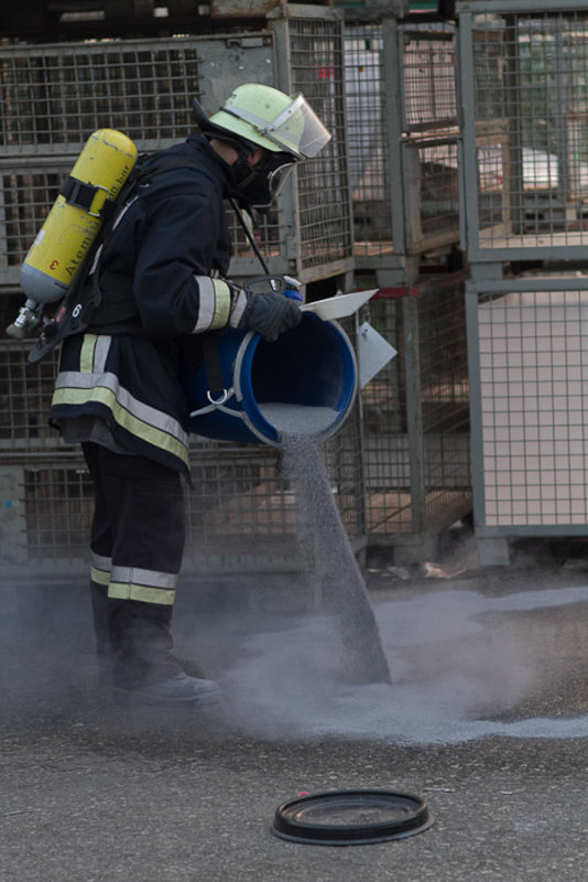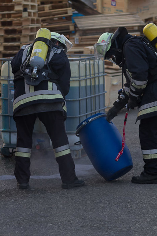 Anhand der UN Nummer 3287 (giftiger anorganischer Stoff;N.A.G.) stellte sich rasch heraus, dass die weiteren Möglichkeiten einer Verschließung oder Umfüllaktion nicht durch die Einsatzkräfte der Betriebsfeuerwehr und der Feuerwehr Diepersdorf durchführbar war, da Chemikalienschutzanzüge benötigt wurden. Die Abfrage über die Gefahren, Bergung und erste Maßnahmen erfolgt über die Ermittlung eines speziellen Apps eines Smart Phones, diese hätte alternativ auch über die Leitstelle Nürnberg erfragt werden können. So musste auf die „nachalarmierten“ Kräfte gewartet werden. So nahm der Atemschutztrupp noch die austretende Flüssigkeit auf und begab sich dann aus dem Gefahrenbereich.