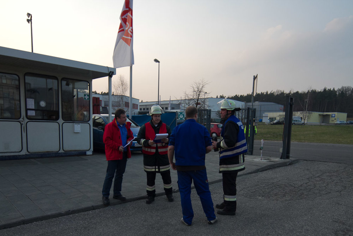 Durch den Störfallbeauftragten der Firma wurde um 18:50Uhr eine Alarmmeldung an die Betriebsfeuerwehr und die Freiwillige Feuerwehr Diepersdorf ausgelöst. Beim Eintreffen des Löschzugs waren bereits erste Helfer der Betriebsfeuerwehr vor Ort die sich als Einweiser positionierten. Ein weiterer Teil der Kollegen hatte bereits eine Evakuierung und erste Absperrmaßnahmen vorgenommen. Während der Erkundung durch den stellvertretenden Kommandanten der Betriebsfeuerwehr zusammen mit dem Gruppenführer des LF 16/12 sperrte die restliche Besatzung den Unfallort großräumig ab. Eine Sammelstelle wurde gemäß Einsatzplan eingerichtet, wobei die Beachtung der Windrichtung eine erhebliche Rolle spielte.